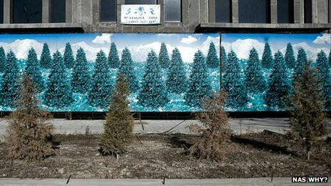 fir trees: islam karimow the current president/autocrat (ever since the countries independence and actually already before that time…) has a great liking for conifers,  which lead him to get rid of the old and huge trees in the city center and plant little fir trees instead. no more shade, no more people spending time in the shade of trees – might have been on purpose. a few weeks ago a group of artists calling themselves ‘nas why?’ or ‘why us’ decided on an exhibiton called ‘my favorite tree’ which dealt with conifer trees and their sudden appearance on (formerly) public squares, on advertisements and on the covering plastic foils which are used to beautify or rather hide building-sites from touristic and maybe also the presidential view. in the days following the exhibtion the omnipresent secret service of the country was sent to track down the artists involved – as far as i read, happily without success…